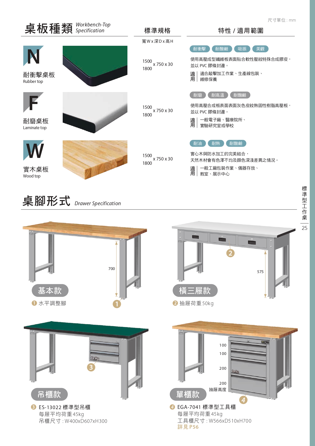 ► 工廠工作桌有耐磨、耐衝擊及原木桌板可選購。
